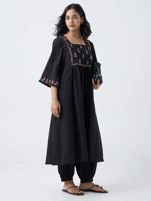 Black Viscose Rayon Solid Embroidered Straight Mens Kurta